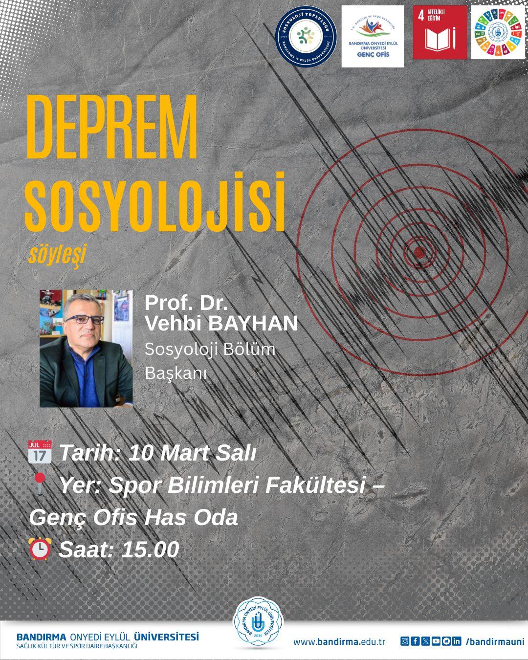 Sosyoloji Bölüm Başkanımız Prof. Dr. Vehbi Bayhan'ın "Deprem Sosyolojisi" başlıklı söyleşisi 10 Mart 2026 Salı günü 15:00'da Spor Bilimleri Fakültesi Genç Ofis Has Oda'da gerçekleşecektir.