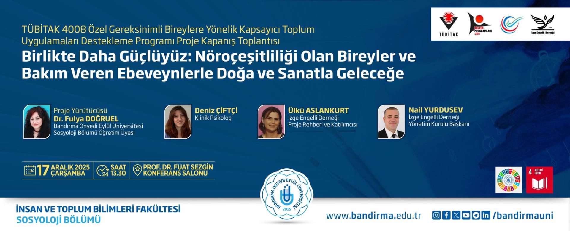 Sosyoloji Bölümümüz öğretim üyelerinden Dr. Öğr. Üyesi Fulya DOĞRUEL'İN TÜBİTAK 4008 Özel Gereksinimli Bireylere Yönelik Kapsayıcı Toplum Uygulamaları Destekleme Programı Proje Kapanış Toplantısı 17 Aralık 2025 Çarşamba günü 14:30'da Prof. Dr. Fuat Sezgin Konferans Salonu'nda gerçekleşecektir.