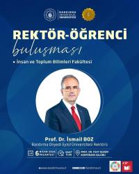 Üniversitemizde düzenli olarak gerçekleştirilen “Rektör-Öğrenci Buluşmaları” kapsamında Rektörümüz Prof. Dr. İsmail Boz; İnsan ve Toplum Bilimleri Fakültesi öğrencilerimizle bir araya gelecektir.