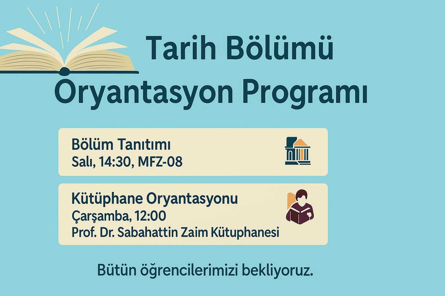 Üniversitemize yeni başlayan öğrencilerimizin akademik hayata uyum sağlamalarını desteklemek amacıyla Tarih Bölümümüz tarafından bir Oryantasyon Programı planlanmıştır. Program kapsamında öğrencilerimizin hem bölümümüzün akademik işleyişini yakından tanımaları hem de üniversite kütüphanesini etkin bir biçimde kullanma becerisi kazanmaları hedeflenmektedir. Bölüm tanıtımına yönelik ilk program Salı günü saat 14.30’da MFZ-08’de yapılacak olup, bölümün işleyişi, ders içerikleri, danışmanlık sistemi ve akademik süreçler hakkında bilgilendirme gerçekleştirilecektir. Çarşamba günü saat 12.00’de Prof. Dr. Sabahattin Zaim Kütüphanesi’nde yapılacak olan ikinci programda ise kütüphane hizmetleri, elektronik veri tabanları, katalog tarama yöntemleri, araştırma teknikleri ve ödünç alma işlemleri uygulamalı olarak tanıtılacaktır.