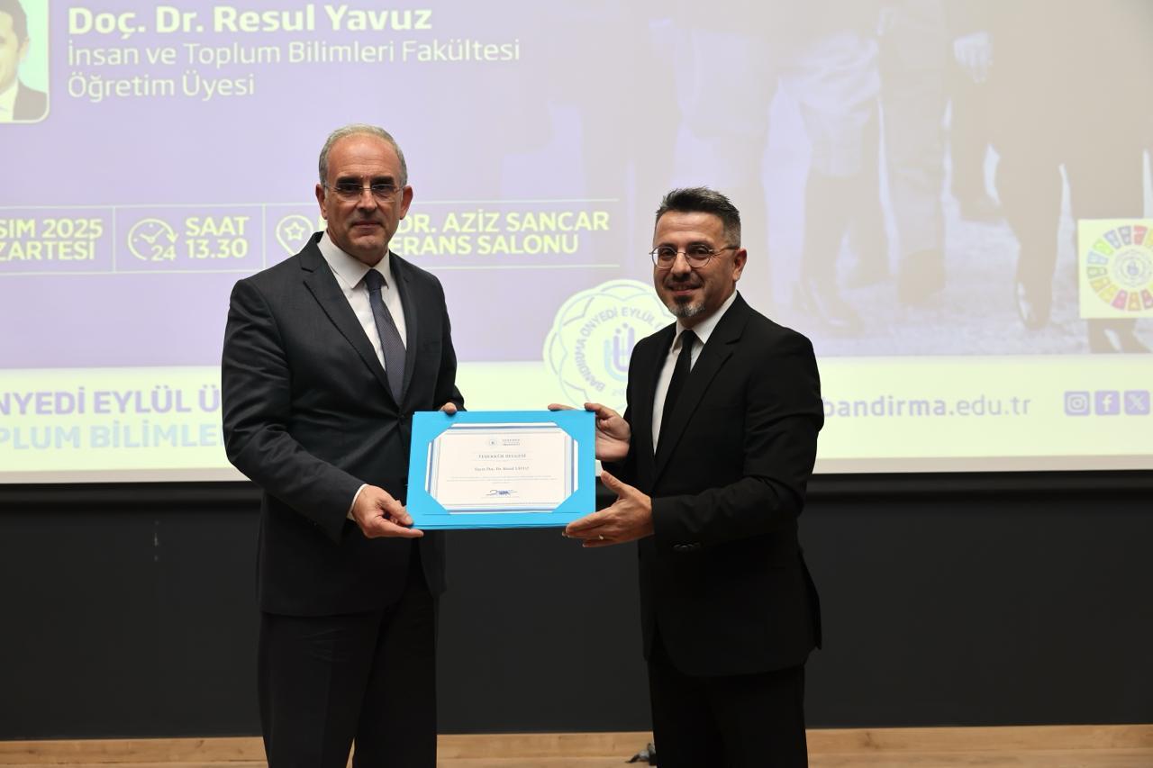 Konferansın sonunda Rektörümüz Prof. Dr. İsmail Boz, katkılarından dolayı Doç. Dr. Resul Yavuz’a teşekkür belgesi takdim etti. Etkinlik, günün anısına çekilen toplu hatıra fotoğrafıyla sona erdi